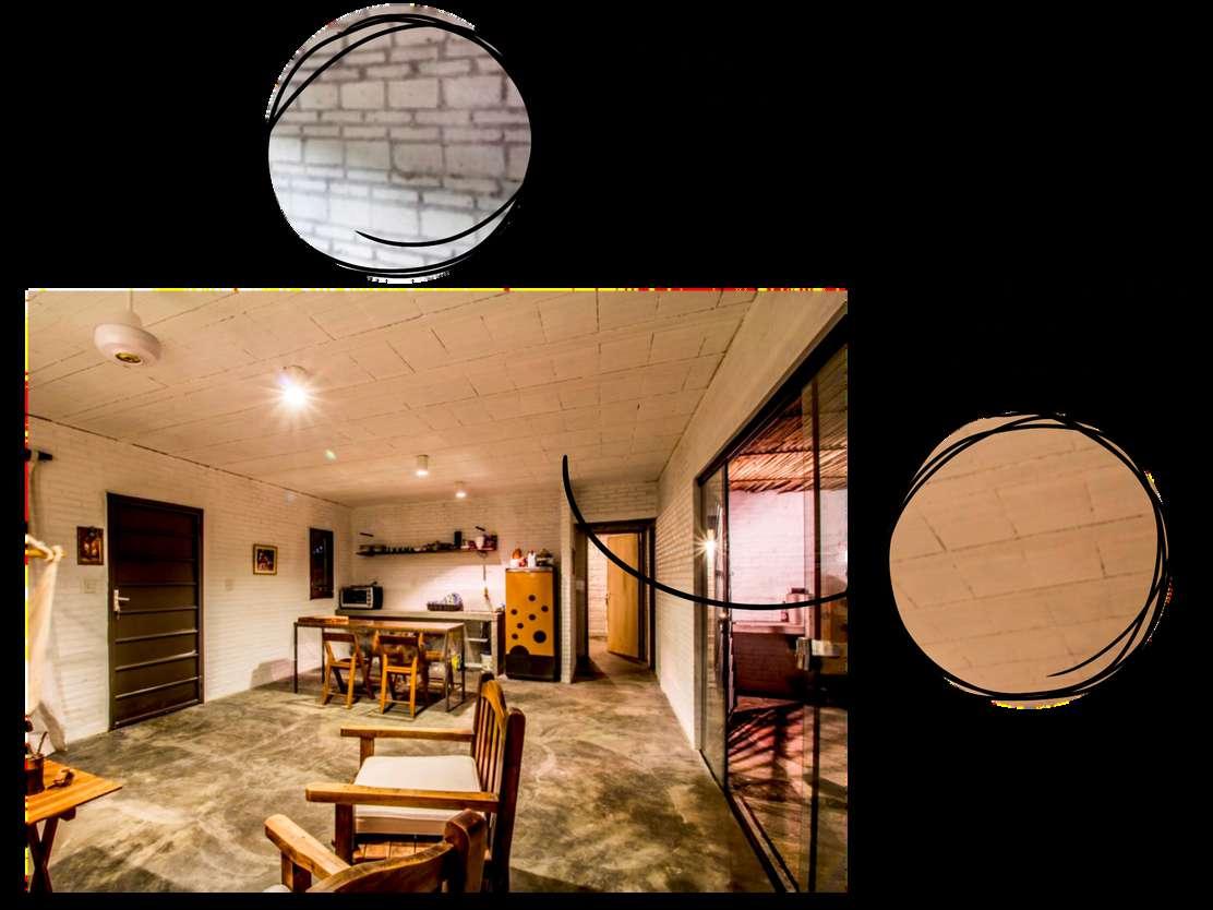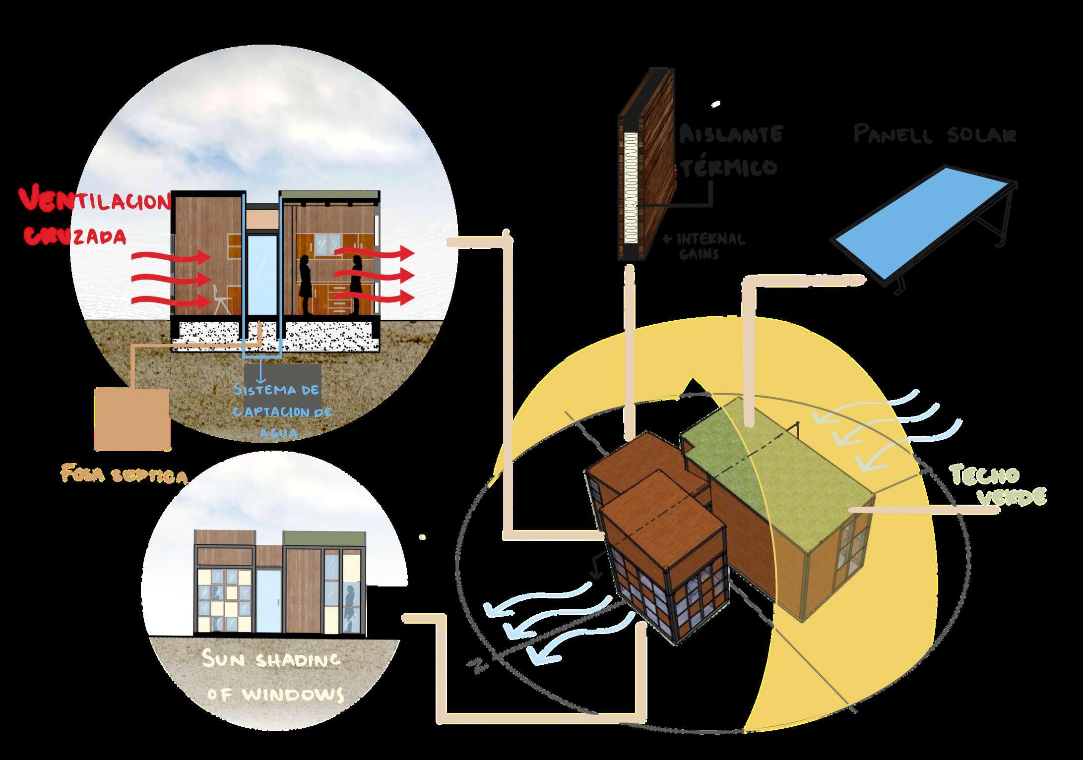 Materiales: Es una vivienda que responde al clima de la ubicación con materiales de bajo costo, cuenta con una ventilación cruzada que se logra en el espacio social principal. Características: