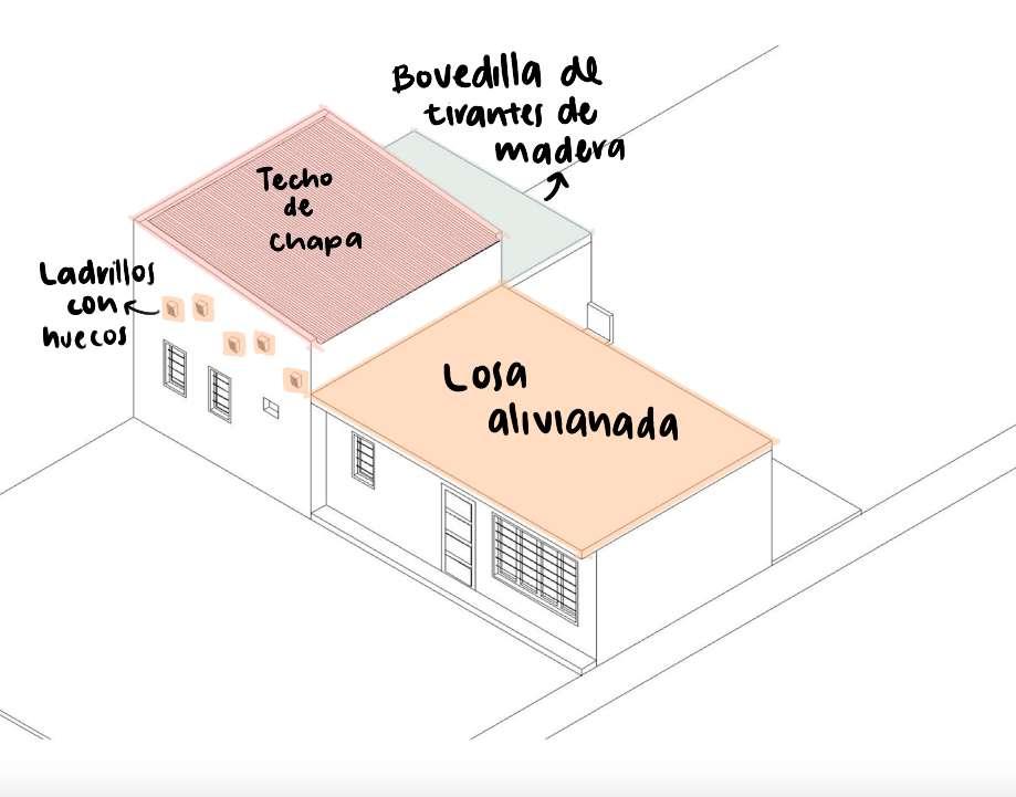 Aberturas reutilizadas Coberturas horizontales losa alivianada techo de chapa bovedilla de tirantes de madera y tejuelón cerámico reutilizados.