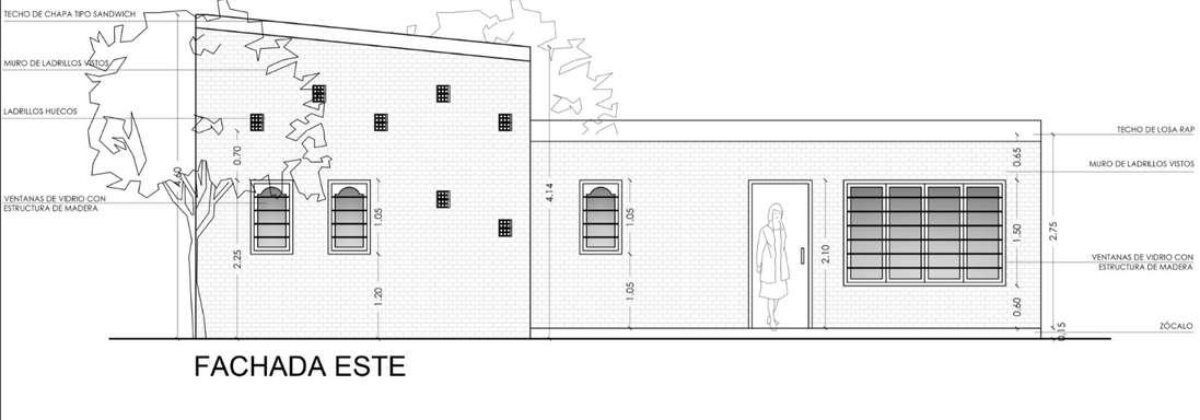 A D E 6.70 4.90 1.60 N.P.TN.P.TN.P.T+0.15m+3.00m+3.50m 0 0.5m 1m 2m FachadaSur Escala1:25 Nombredelproyecto CasaIldfly Simbología Áreas Cocina/comedor 6.00m2 Estudio 4.14m2 Autores SalvadorCuatetlChiquito Materia:Viviendaunifamiliar Fecha Escala 08/09/2022 1:25 Plano Clave FachadaSur PA-04 Ubicación:Nanacamilpa,Tlaxcala Coordenadas:19.476022, -98.596785 N N.P.TB.A.P.BajadadeaguapluvialNiveldepisoterminado