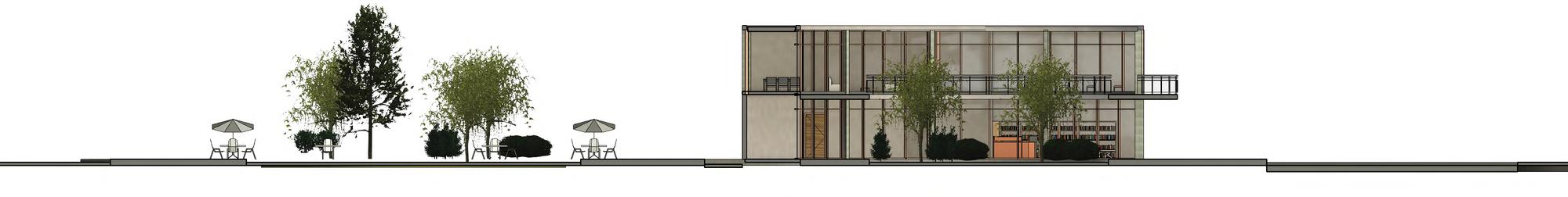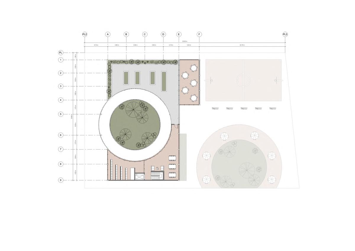 El patio central es el alma del Centro Monarca, por su papel fundamental en el funcionamiento del centro comunitario No solo es la entrada al centro, sino que también tiene un remate visual de 360° de su jardín y árboles, enmarcado por una forma circular que permite una vista del patio desde todos los espacios Al tener esta conexión con el resto de espacios, sirve como patio distribuidor y centraliza las circulaciones del edificio Debido al flujo constante del centro, tener una única entrada y visión desde cualquier punto del edificio sirve como primera capa de seguridad