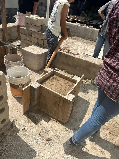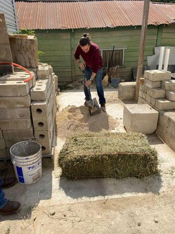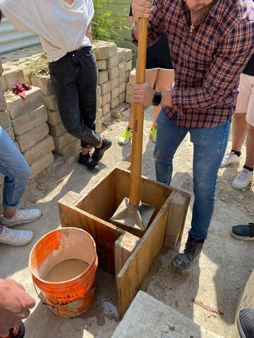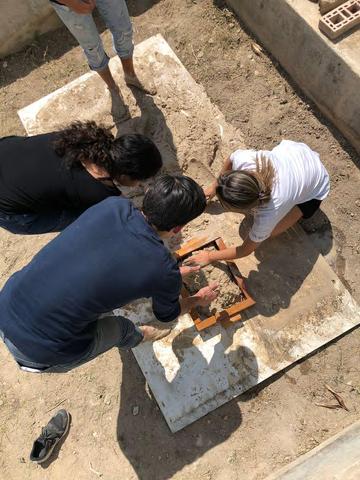 Para la preparación del adobe mezclamos tierra con agua y paja Dado el peso que generaba la masa, tuvimos que mezclarla con los pies, que es el método de amasado tradicional Luego ponemos la mezcla en moldes de madera y desmoldamos Este sistema constructivo tiene bajo impacto ambiental y tiene propiedades térmicas reconfortantes; estas propiedades podrían ser útiles dada nuestra región y clima árido. Entre otras ventajas del adobe están sus materiales ecológicos y su proceso de fabricación de ladrillos ágil y sencillo