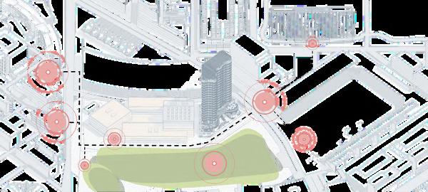 De izquierda a derecha se encuentran el campus y aulas del Tec de Monterrey, el Skyspace de James Turrel, el Centro de Bienestar, el Parque Central, el Estadio Banorte y el Polideportivo de Borregos; todos, espacios frecuentados por estudiantes y colaboradores