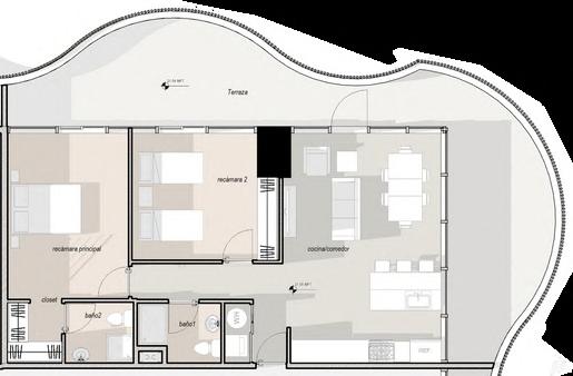 Las áreas de servicio como cocina, comedor y baños se ubican hacia las fachadas que sufren mayor incidencia térmica; mientras tanto, en la fachada noroeste se ubican zonas de descanso como el Dormitorio