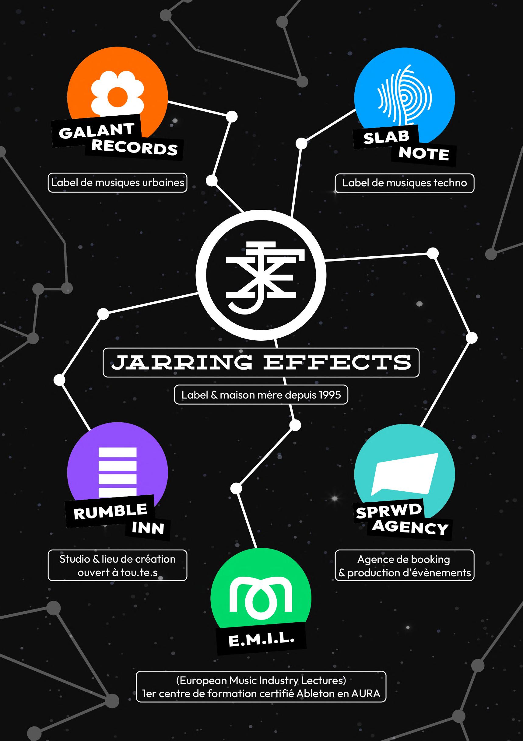 Jarring Effects, nom de code JFX, pérennise son rôle de maison-mère et de label. S’il y a une règle à laquelle on ne déroge pas, c’est bien la défense des musiques anticonformistes. On encourage, plus que jamais, les artistes à être indépendant·e·s, créatif·ve·s et à produire la musique qu’iels aiment plutôt que de chercher à répondre aux critères commerciaux. Autour de la maison mère Jarring Effects gravite la constellation JFX.