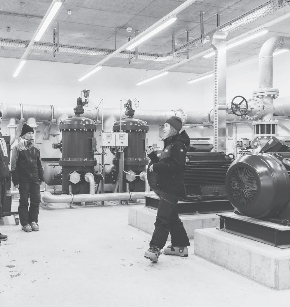 To get used to the equipment, you descend the first few metres to the valley station of the Gargellner Köpfe chairlift. “Once we're on our own in the ski area, we can take the opportunity for a look behind the scenes,” explains Svea. During a detour to the pump house, you’ll gain interesting insights into how a ski area operates.