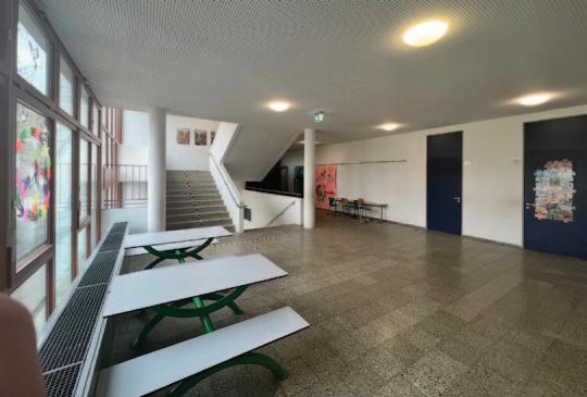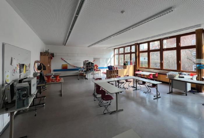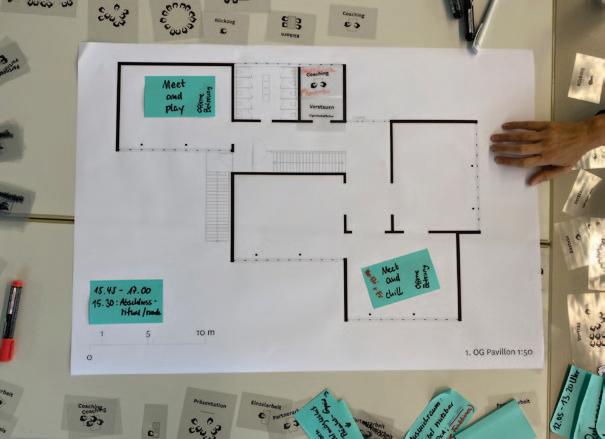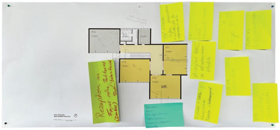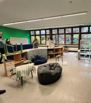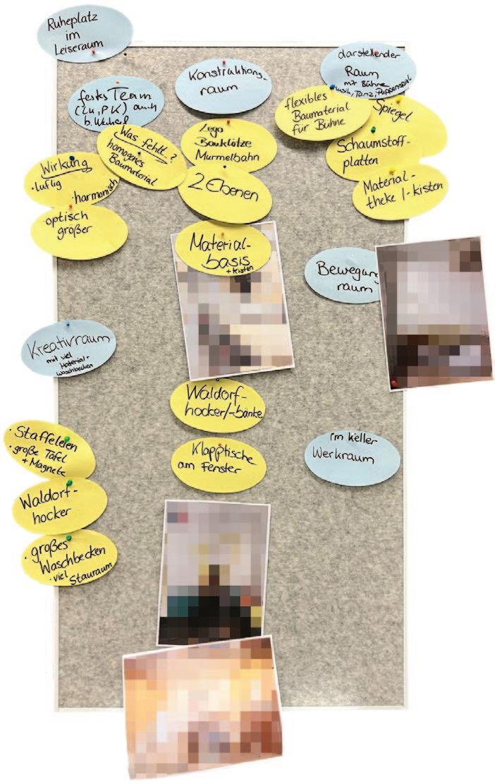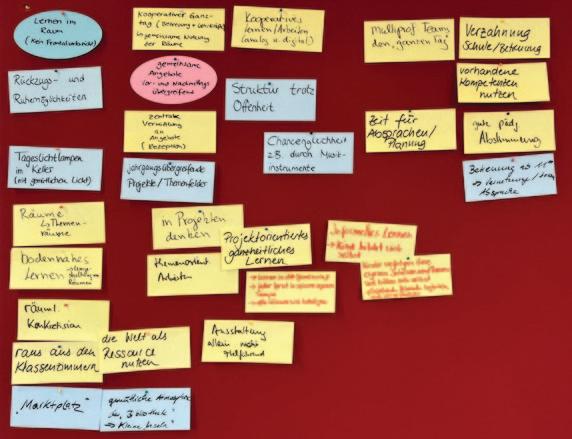 - Der Versuch Räume zu schaffen, in denen alle Professionen eine Heimat haben. Keine strikte Trennung zwischen Klassen- und Freizeiträumen. – Raum und Zeit für Kommunikation/ Absprachen schaffen.