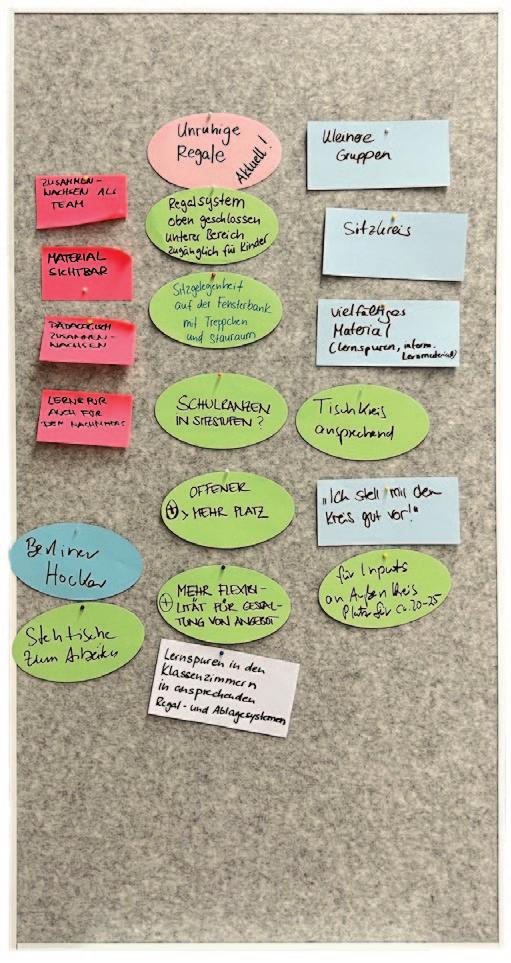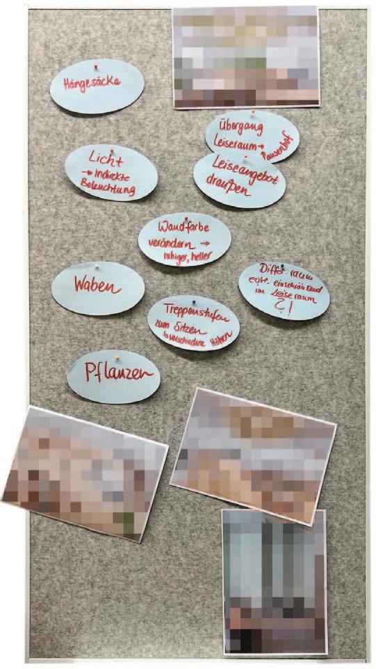 - Weniger Mobiliar im Klassenzimmer, mehr Lernorte im Klassenzimmer verstreut, flexiblere Möbel (z. B. Dreieckstische und Nischen, stapelbare Bänke für Stuhlkreise …) - mehr Absprachen im Team Betreuer*innen, Schulbegleiter*innen, Lehrer*innen … feste Zeit dafür? Bzw. bessere Zusammenarbeit, indem Betreuer*innen z. T. auch im Unterricht teilweise dabei sind. – Angebote in den Pausen auf dem Schulhof sollten dringend verbessert werden (Fahrzeuge, Nischen, Häuschen, Rückzug, mehr Ruhe, mehr Angebote auf spielerisches Ebene).