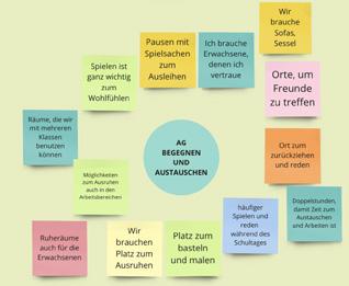 Der Erweiterungsbau mit Ganztagsräumen oder ein kompletter Neubau stellen jedoch oft keine zeitgemäße und nachhaltige Lösung dar. Vielmehr sind gemeinsam entwickelte Nutzungskonzepte für die bestehenden Räumlichkeiten unter Einbeziehung der Flächenressourcen innerhalb des Quartiers sowie Umbaumaßnahmen hin zu mehr Transparenz, ein neues Brandschutzkonzept und