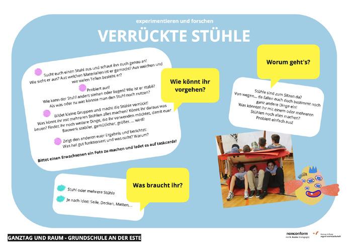 Hier setzt das Projekt „Ganztag und Raum“ der Montag Stiftung Jugend und Gesellschaft an. Gemeinsam mit fünf Pilotstandorten wurden integrierte Nutzungskonzepte für einen qualitativen Ganztag entwickelt. Zum Nutzungskonzept gehört die Formulierung eines gemeinsamen Bildungsverständnisses, organisatorische Veränderungen des Tagesablaufs, eine gemeinsame multiprofessionelle Teamarbeit sowie konkrete Vorschläge für Umbaumaßnahmen, veränderte Brandschutzkonzepte und Innenund Außeneinrichtung.