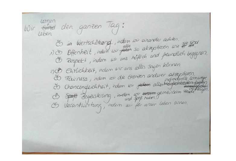 Alle Kinder sind ein gleichwertiger Teil der Schulgemeinschaft. Sie entwickeln sich in einem vertrauensvollen Umfeld ihrer Persönlichkeit entsprechend. Wir vermitteln und fördern Grundlagen für ein friedliches, respektvolles Miteinander.