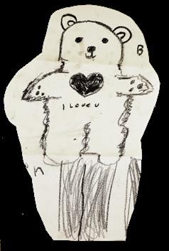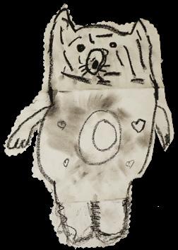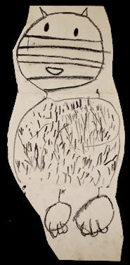 Das ist Scheuze, ein Fantasietier. Er isst Spaghetti, man kann mit ihm toben und kuscheln. Er ist lieb und lustig, er spielt sogar Fußball. Mein Lieblingspart: er kann fliegen und ist kuschelig.