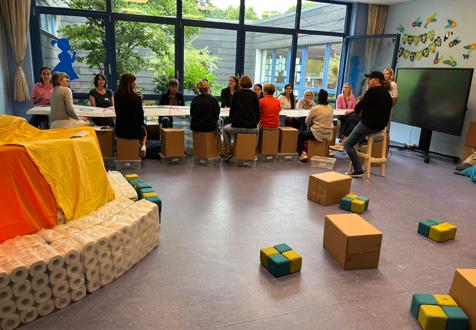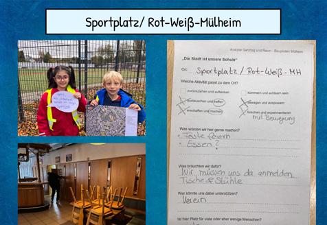 Die Stadt Mülheim an der Ruhr legte von Anfang an durch begleitete Qualitätsoffensiven viel Wert auf hohe Qualität in der Offenen Ganztagsschule. Der Rechtsanspruch auf Ganztagsbetreuung ab dem Schuljahr 2026/2027 stellt die Stadt nun vor neue Aufgaben: Trotz finanzieller, personeller und vor allem räumlicher Herausforderungen gilt es, die Betreuungsquote zu steigern und gleichzeitig ein wertvolles Angebot zu gewährleisten. Dies ist zugleich eine Chance, die Offene Ganztagsschule pädagogisch und räumlich zukunftsfähig zu machen. Bereits zum Beginn des Projekts war das pädagogische Konzept der Grundschule am Dichterviertel hoch entwickelt. Als Familiengrundschulzentrum öffnete sich die Schule bereits in den Sozialraum und es waren Team- und Organisationsstrukturen vorhanden, auf die weiter aufgebaut werden konnte. Im Prozess wurden die additiven Elemente der Organisation weiter aufgelöst, der Schultag weiter rhythmisiert und Vor- und Nachmittag enger miteinander verzahnt. Die Räume der Schule zeichneten sich vor dem Projekt durch eine starke Mehrfachnutzung aus. Im Prozess wurden Raum und Pädagogik verknüpft und das Schulgebäude neu interpretiert. Es wurden Lernhandlungen identifiziert und in ein räumliches Konzept übertragen, das verschiedenen Bereichen der Schule spezifische Qualitäten zuordnet. Als Ergebnis steht nun ein gemeinsam entwickeltes integriertes Nutzungskonzept, in dem durch kleinere und mittlere Umbaumaßnahmen wie das Einbauen von Sichtachsen und konkrete Möblierungsvorschläge Erlebnisräume und Lerninseln im Bestandsgebäude geschaffen werden. So kann auf Raumknappheit schneller und klimagerechter reagiert werden als durch Neubaumaßnahmen. Von diesem