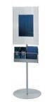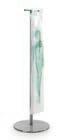 EN_A display totem with an epoxy-coated steel tube upright supporting a display unit made from steel and transparent PET and/or supporting steel brochure/leafletholder.