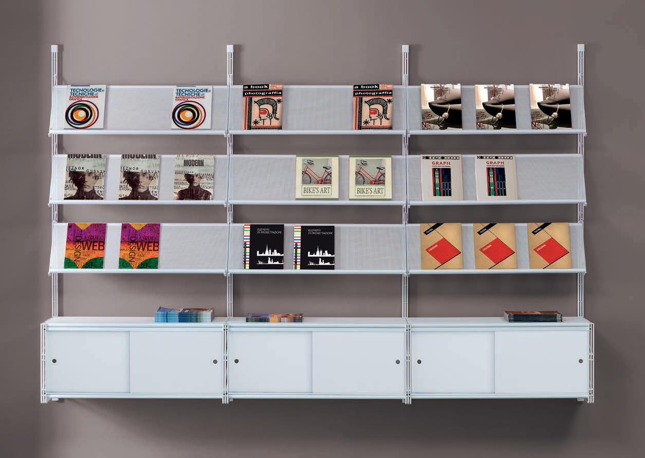 I_Gli espositori sono liberamente applicabili su due cavi di acciaio con diverse opzioni di aggancio a parete e a soffitto.
