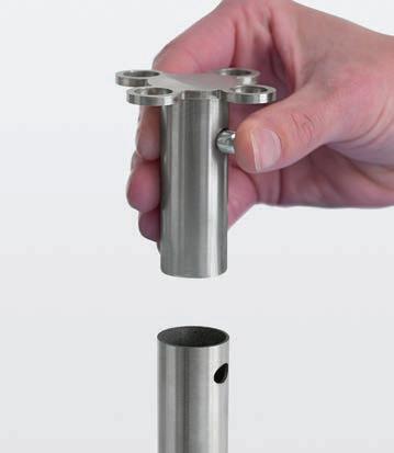 E_Set está formada por un poste de acero inoxidable satinado con base circular, disponible con acabados en acero inoxidable satinado o recubierta en color negro gofrado. El cabezal del poste está dotado de un innovador sistema de fijación que permite enganchar y desenganchar los accesorios de forma sencilla y rápida.