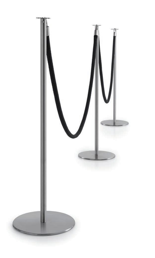D_Battista Standsäulen mit Kordeln aus Technopolymer und verchromten Metallhaken. Die Säule ist aus pulverbeschichtetem Stahl mit Fuß bzw. Bodenplatte aus pulverbeschichtetem Gusseisen und Details aus poliertem Aluminium oder Edelstahl.