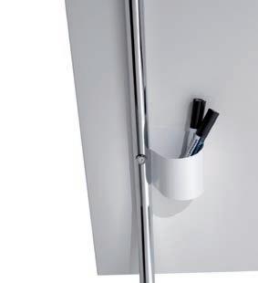 E_Superficies laminadas de escritura con estructura de acero cromado, que se componen de una base de aluminio brillante montada sobre ruedas con freno. Las superficies para escribir se pueden completar con un elemento fonoabsorbente de tejido acústico Snowsound Fiber Textiles acolchado con fibras de poliéster, que se adhiere mediante Velcro a la parte posterior de la superficie. El tejido es extraible y lavable.