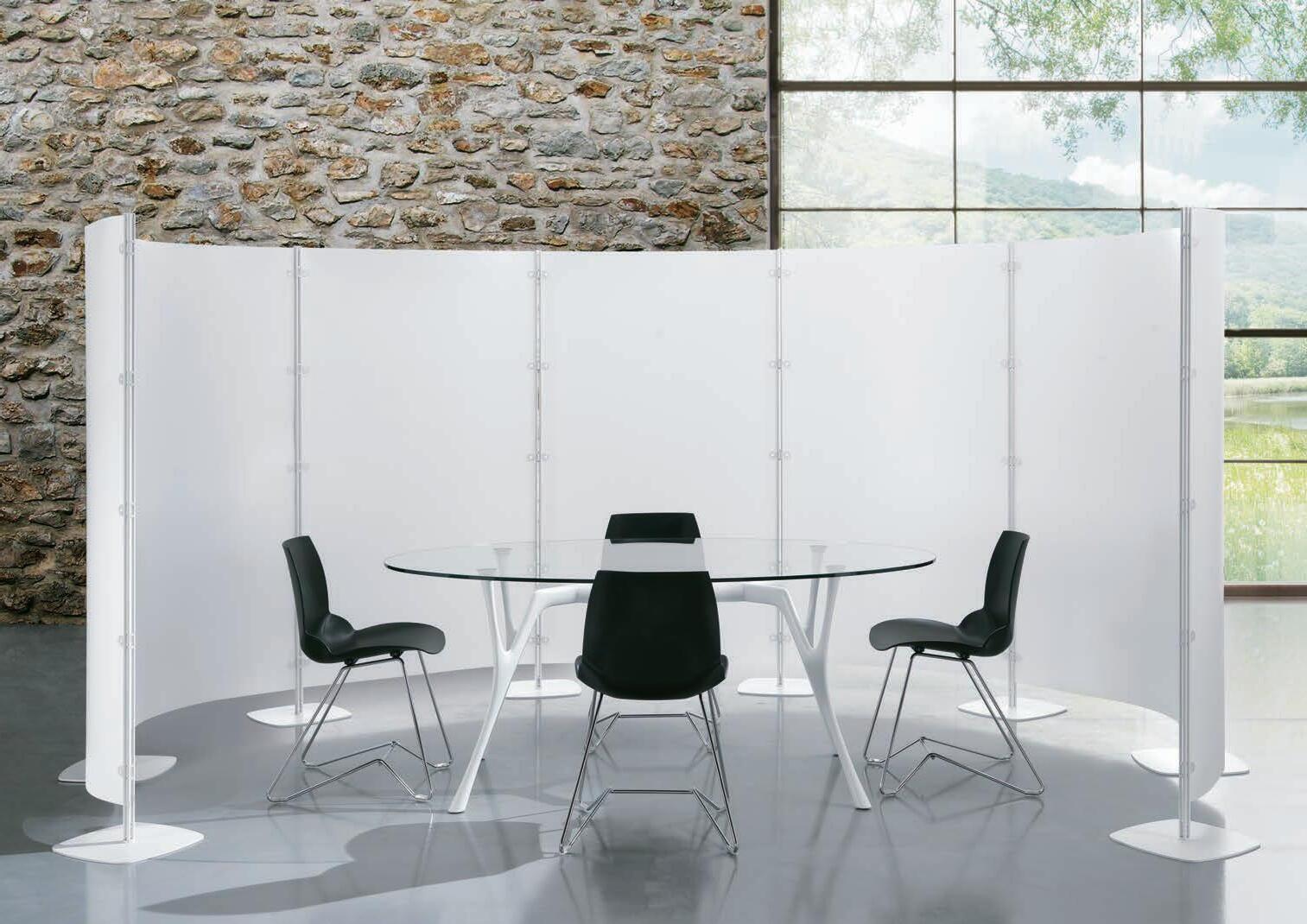 F_Elément de séparation original avec des colonnes latérales en acier recouvertes et liées à un seul cordon flexible en technopolymère. Bases en acier inoxydable massif. Gastone est facile à transporter, élégant et approprié à tout type d’intérieur.