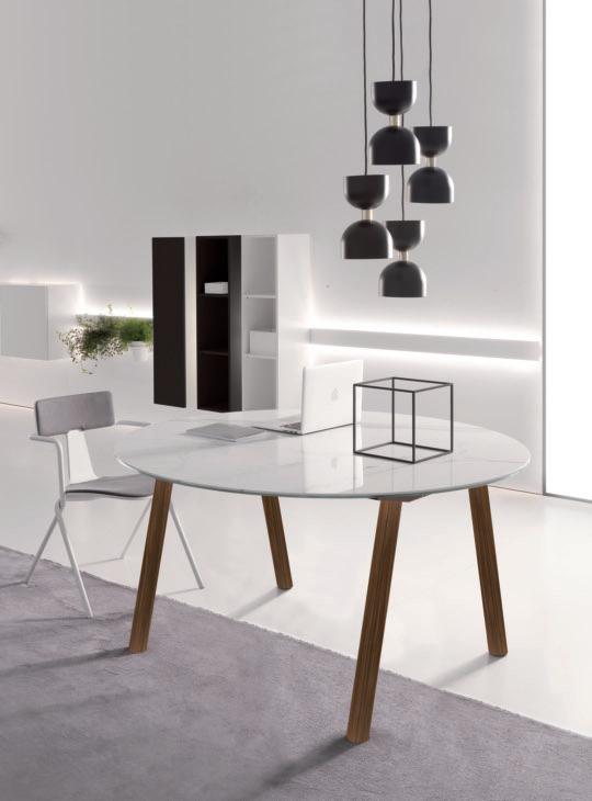 Sculptural contrast of weights and volumes for the meeting tables of the Vigo series.