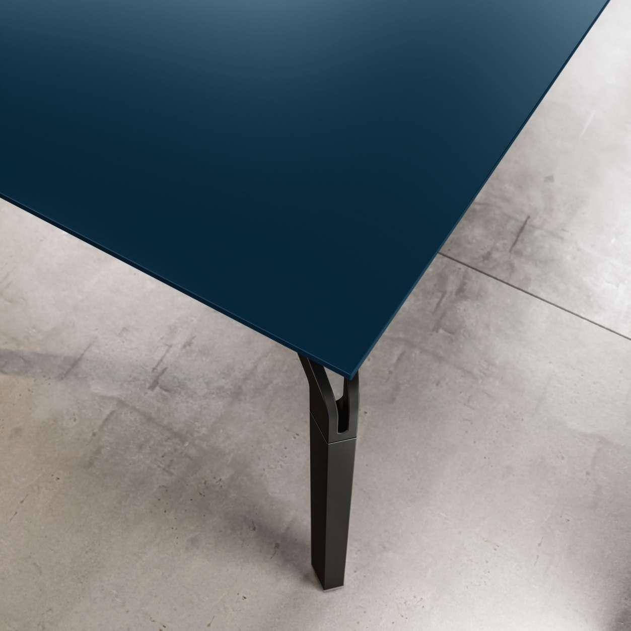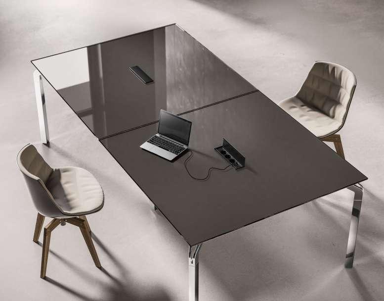 Le verre, avec son élégance naturelle, est le choix idéal pour valoriser le prestige des bureaux directionnels et des salles de représentation. Le caractère moderne du design est évident dans la combinaison entre la transparence du plan, décliné en 3 nuances différentes, et la structure apparente en aluminium. Une combinaison qui donne légèreté et continuité visuelle.