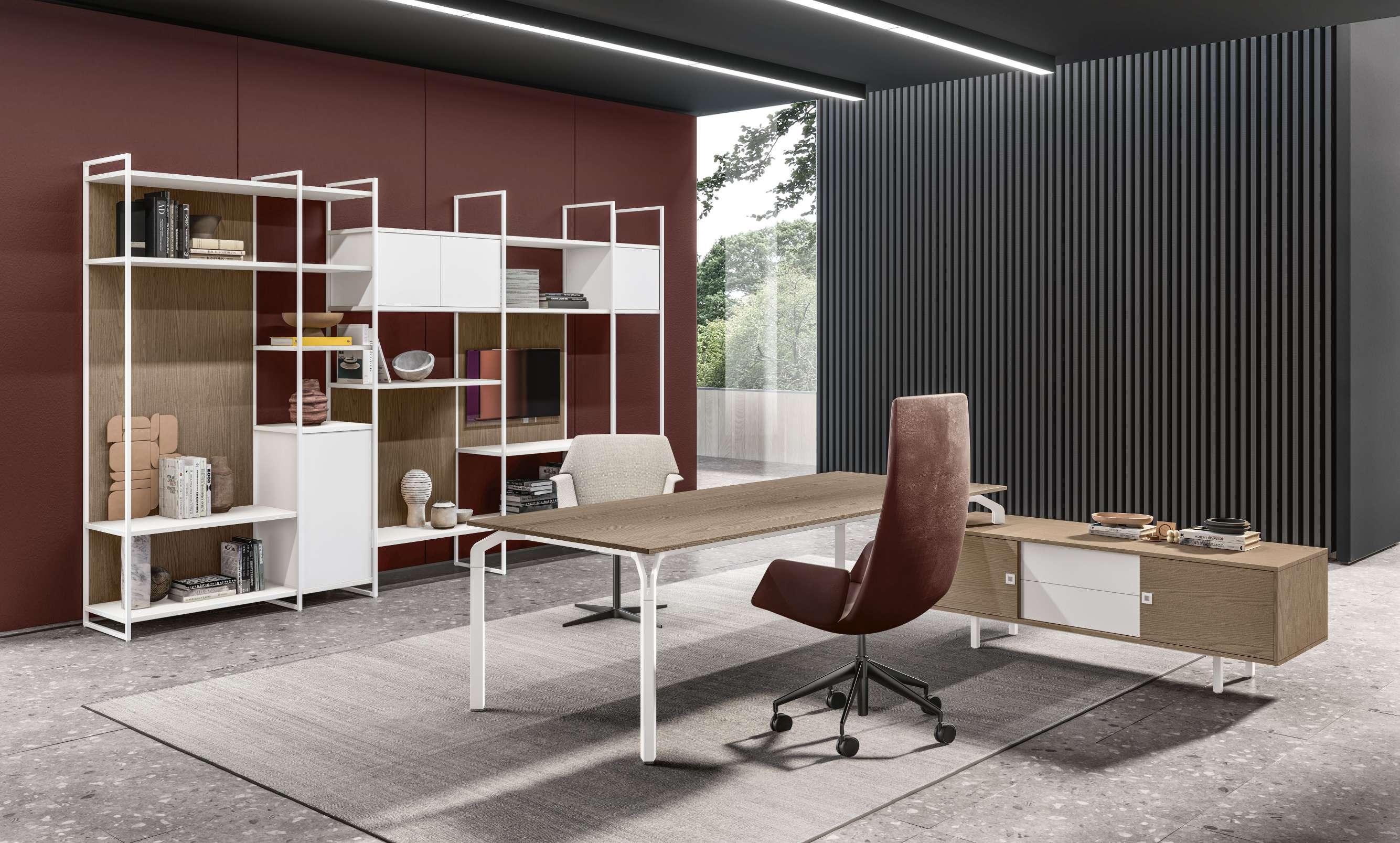 Forte personnalité pour le bureau avec plateau plaqué Noce Tabacco en finition mate, caractérisé par des larges veines qui exaltent l’effet naturel de la composition avec structure noire.