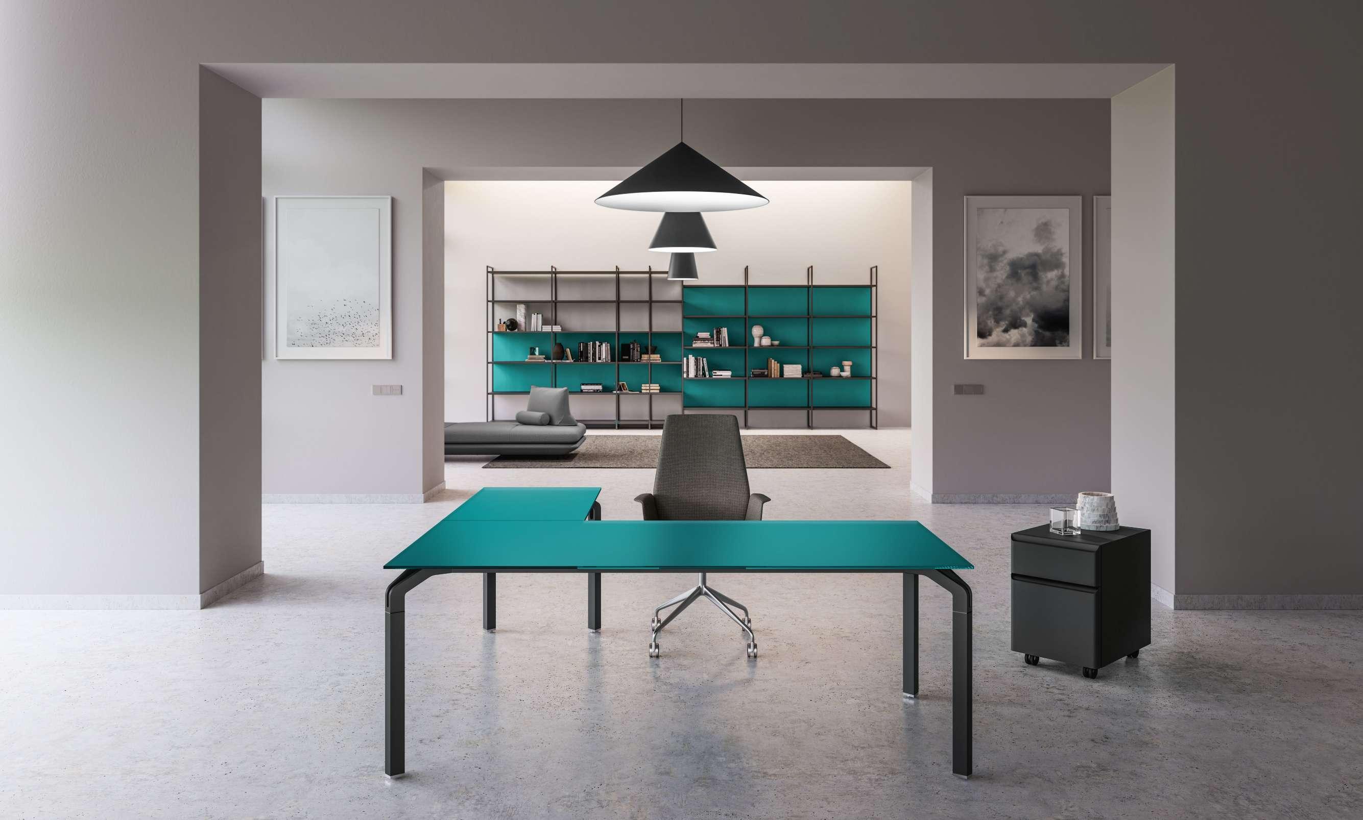 Sobria eleganza e design accattivante per le scrivanie con piano in vetro retro-laccato. La finitura lucida conferisce un’atmosfera raffinata, mentre la finitura opaca NO-PRINT dona un piacevole effetto vellutato. Di grande impatto il contrasto tra la luminosità del vetro e la materica struttura in alluminio.