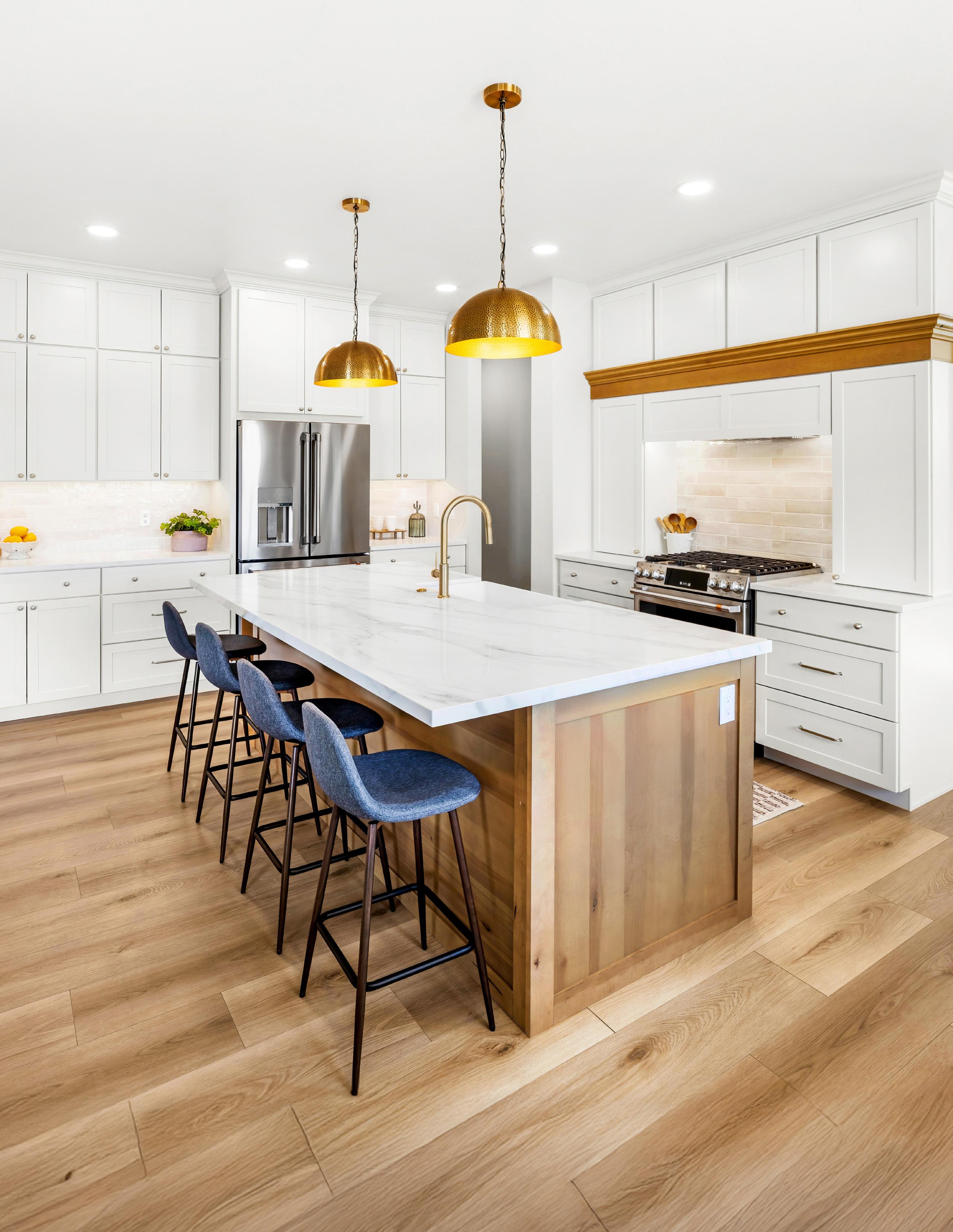 At the heart of the home, the kitchen stuns with a blend of beauty and function. Quartz countertops, custom-crafted hood vent, and a large island play host to culinary creativity and everyday gathering.