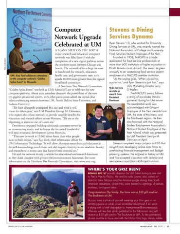 Stevens a Dining Services Dynamo Ryan Stevens ’10, who worked for University Dining Services at UM, was recently named the National Association of College and University Food Services Student Employee of the Year. Founded in 1958, NACUFS is a trade association for food service professionals at more than 600 institutions of higher education in North America and abroad. The award is given annually to an outstanding food service student employee at a NACUFS member institution. “As the saying goes, ‘When you’re hot, you’re hot,’ and Ryan Stevens is just that,” says UDS Marketing Director Jerry Ryan Stevens O’Malley. accepts an The NACUFS award follows award from a string of accolades Stevens President Dennison. garnered during his UM tenure. His exceptional work was acknowledged with Student Employee of the Year awards from UM, the state of Montana, and the Northwest region. He then was honored with the National Student Employment Association’s National Student Employee of the Year Award, which was presented by UM President George M. Dennison in April. Stevens completed major projects at UDS that ranged from developing online data forms to overhauling financial-management and budgetplanning systems. He majored in history at UM and has accepted a position with defense and aerospace corporation Northrop-Grumman.
