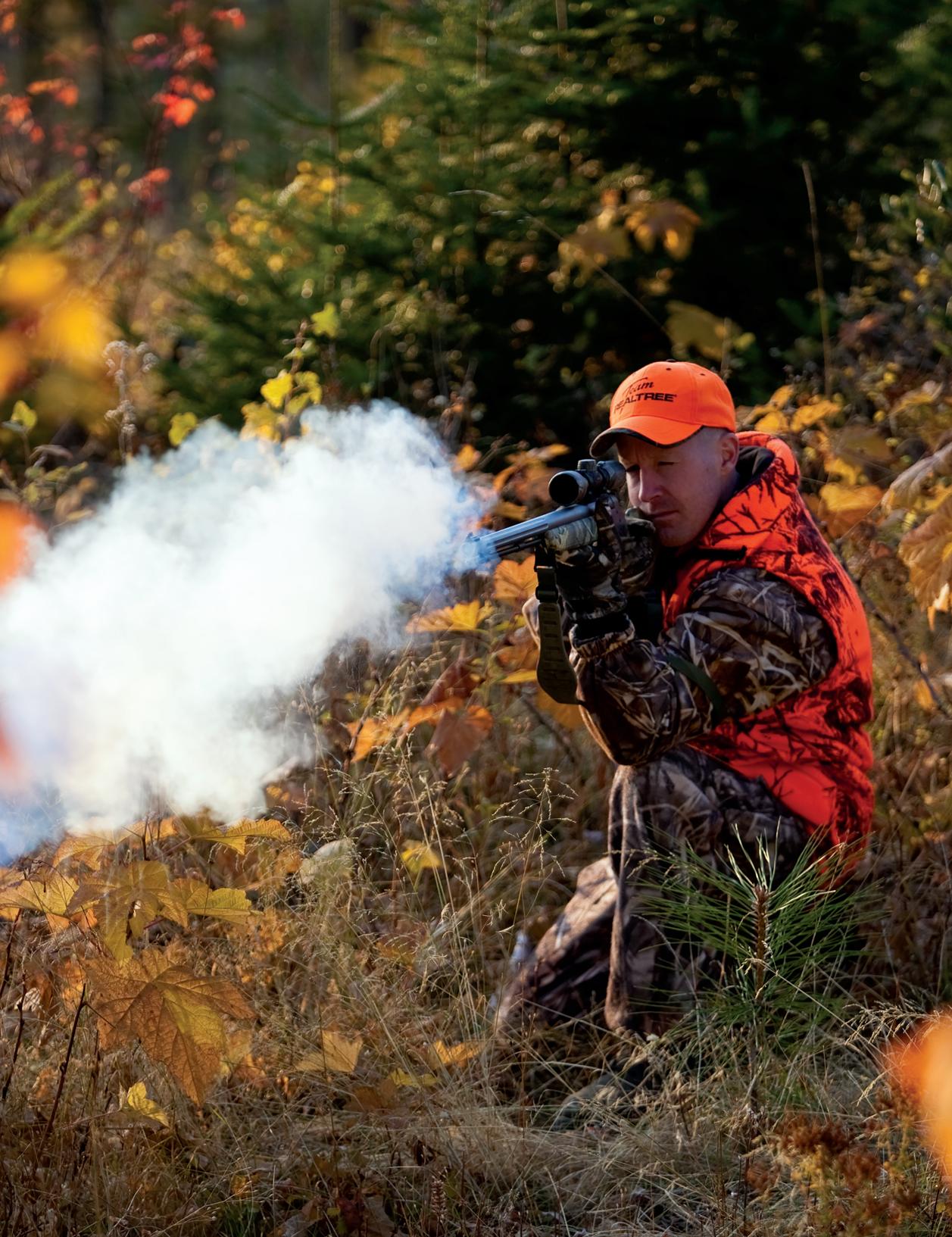SMOKING ALLOWED Both modern (shown here) and traditional muzzleloaders use blackpowder that smokes when ignited. Smokeless powder used in regular rifle cartridges is dangerous in blackpowder rifles because it creates so much pressure it can cause a muzzleloader barrel to rupture.