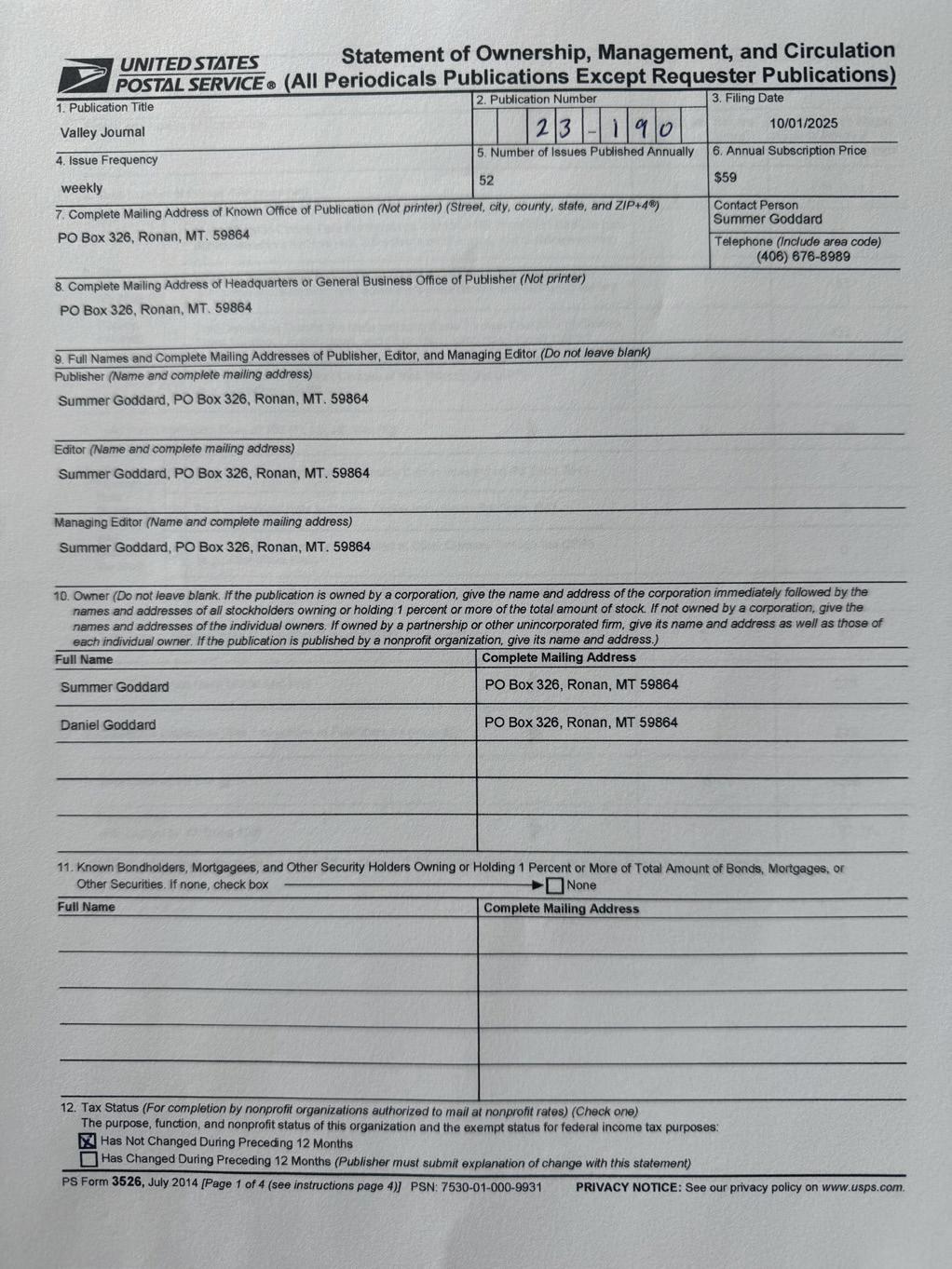 The Valley Journal newspaper (PE 23-190) is published weekly by Valley Journal LLC. Periodicals postage paid at Ronan, MT.