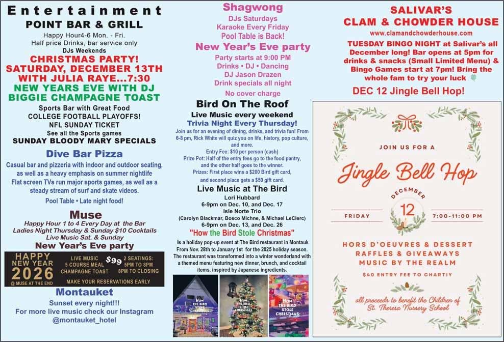 13-14MCOC & Visit Montauk's 4th Annual Magic of Montauk Holiday Fair. The Montauk Chamber of Commerce and Visit Montauk is thrilled to announce the return of our Magic of Montauk Holiday Fair! This fourth annual event consists of a lit holiday path around the town green, featuring holiday gift vendors, hot cocoa contest, children’s activities, festive treats, food trucks, beer and wine, live music, Santa meet and greet, photo spots, and LIVE reindeer! Bundle up, grab your love ones, and don’t miss out on all of the magic Montauk has to offer!