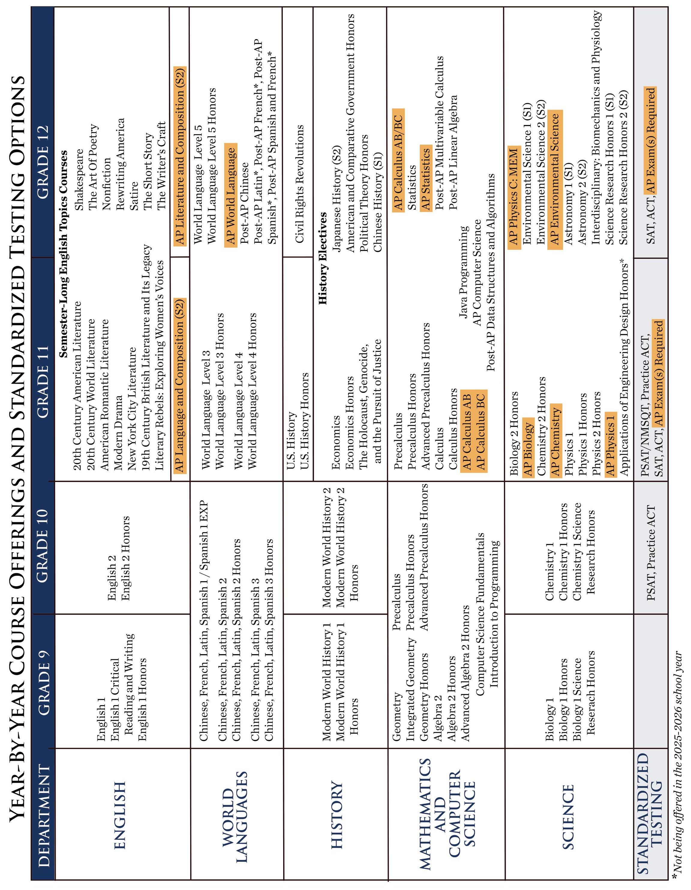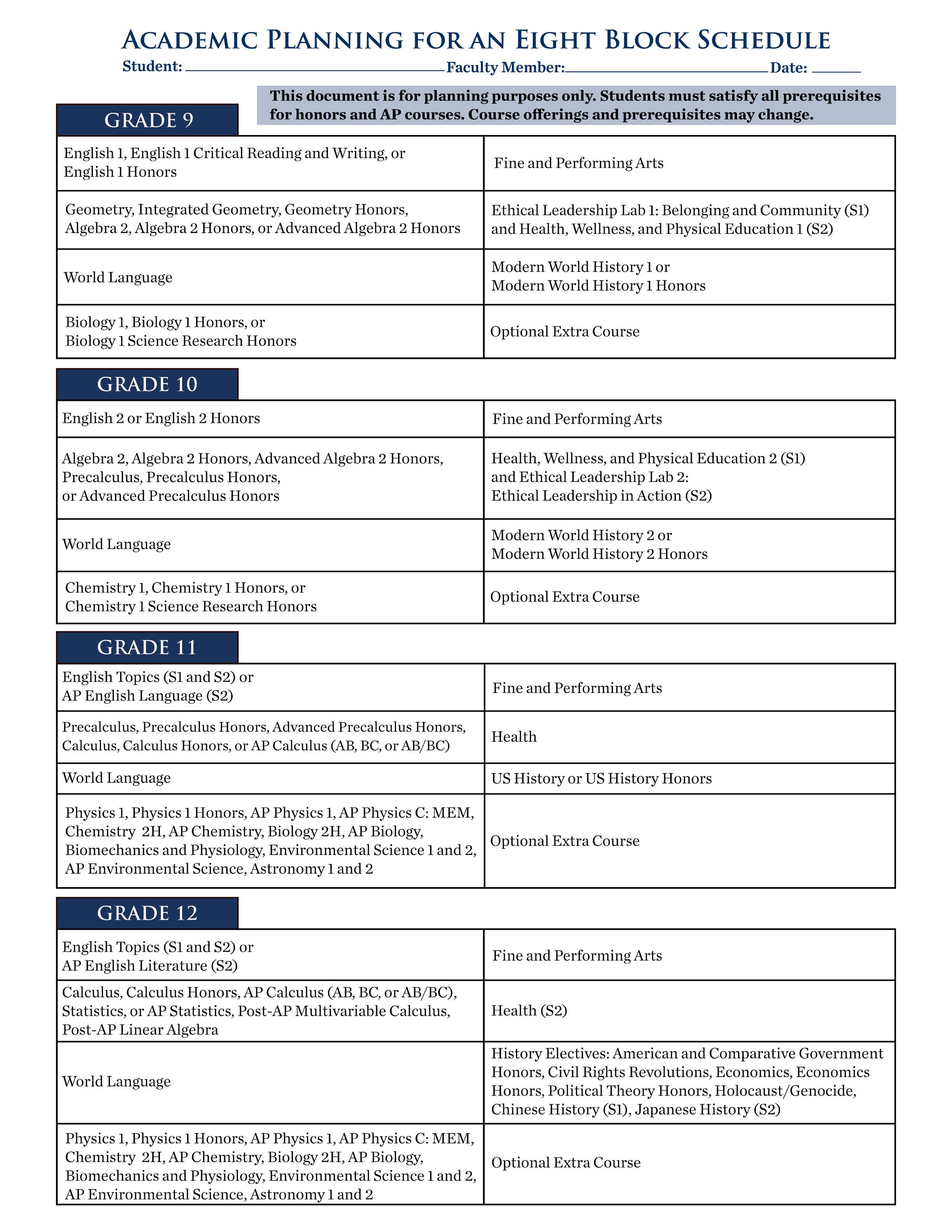 A standard course load is five academic majors each semester, plus one course in the Fine and Performing Arts Department and any other required courses. Enrolling in five academic majors per semester is highly recommended all four years, although a minimum of four academic majors per semester is permitted. For some students, taking an additional course above and beyond the standard load of five academic majors may be appropriate. Students should be aware, however, of the demands of taking additional courses.