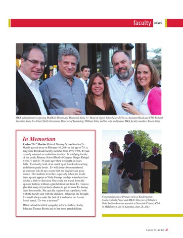 In Memoriam Evelyn “Ev” Martin: Retired Primary School teacher Ev Martin passed away on February 16, 2014 at the age of 78. A long-time Brookside faculty member from 1979-1998, Ev had recently returned as a substitute teacher. In notifying faculty of her death, Primary School Head of Campus Ginger Kriegel wrote, “I met Ev 38 years ago when we taught in Essex Fells. Eventually, both of us ended up at Brookside teaching at different grade levels. Ev will always be remembered as someone who lit up a room with her laughter and good humor. Her students loved her, especially when she would dress up and appear as Viola Swamp, on days when her class needed a little re-direction. One could not travel down the upstairs hallway without a gleeful shout-out from Ev. I am so glad that many of you had a chance to get to know Ev during these last months. She quickly regained her popularity, both with the faculty and with the children. Whatever life brought, Ev would always make the best of it and move on. As one friend stated, “Ev was a treasure!” MKA extends heartfelt sympathy to Ev’s children, Kathy, John and Thomas Boone and to her three grandchildren.