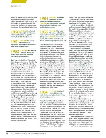often. Vicki and Raoul and Oscar (12) and Iris (11) live in Woolwich ME, about 30 miles from our summer house in Christmas Cove. Nini de Jurenev: Had a delightful and way too short lunch with Carol Barnard Ottenberg and her delightful husband, Simon, when they were in Santa Fe for an opera tour last August. I am now the proud mother of an entire hive of about 40,000 honey bees—an effort to help with the extreme pollinator die-off. I find the bees totally adorable and they have the most delicate and exquisite combs. Betsy Hasbrouck Cole: I had a lovely luncheon with Henny Nelson Skeen in the fall as we live about a half hour from each other in MA. Bob and I had dinner with Peter and Gail Zabriskie Wilson and Aubin Zabriskie Ames ’54 last summer in Little Compton RI. None of them ever seems to change! We hope to see Betsy Beatty Matlock and Lou this winter when they make their annual trip to Vero Beach. We still summer in Little Compton and go to Vero Beach in the winter. In spring and fall, we have an apartment at Fox Hill Village, a retirement community in Westwood MA. Sally Webb is there and also Susan Ruddick. I am active here in a Garden Club, play bridge, and we are part of two lecture series and the symphony. / Ann de Vausney Hallowell: Greetings from Vermont. If you are in Burlington, I would love with see a classmate or two, so give us a call! Jane Romeyn Dunning: I was at Kimberley through grades 2–8. An ordained deacon and priest, I serve as Priest Associate at St. James Episcopal Church in Greenfield MA and as Chaplain for the Shelburne Falls Fire Department. Mother of two, grandmother of six, “with another on the way.” Sue Crook Ferdinand: I have a nice little condo in Lopatcong NJ (that’s Lopatcong, not Hopatcong or the next town over, Pohatcong). I’m still in the face painting business —can’t do as much as I used to,