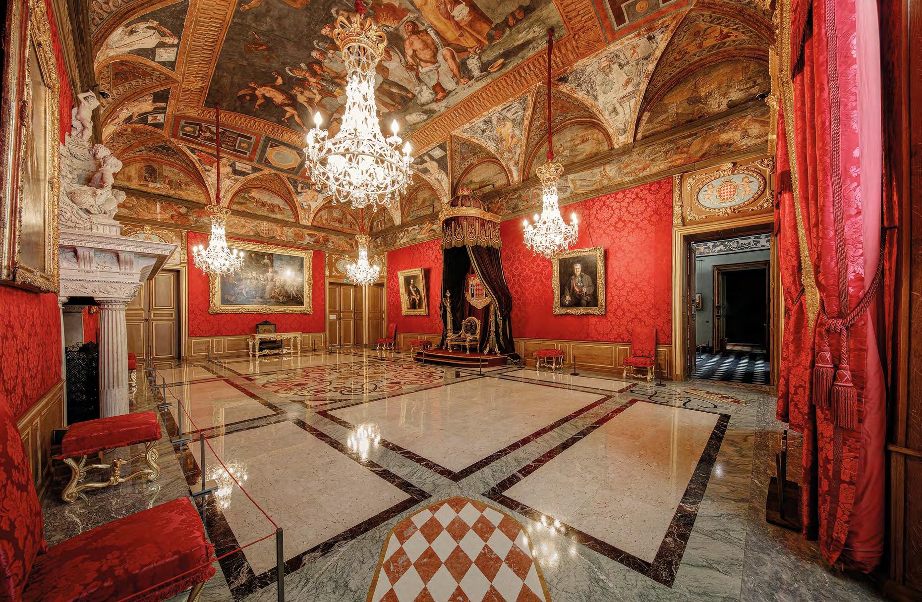 lène ont présenté au peuple les jumeaux Jacques et Gabriella: un moment où histoire familiale et représentation officielle se sont mêlées. De la galerie, on entre dans le Salon de Mazarin, nommé d’après les boiseries importées de France au XVIIe siècle. Sculptures raffinées, cadres dorés et panneaux peints créent une atmosphère chaleureuse et enveloppante. Le mobilier est un triomphe d’ébénisterie: consoles, chaises recouvertes de brocart, lampes aux pieds ciselés. Ici, la lumière filtre doucement, amplifiant les tons miellés du bois. C’est une pièce qui semble faite pour les conversations privées, les accords chuchotés, les moments où la diplomatie s’habille d’élégance. On continue vers le Salon Bleu, où la couleur dominante se décline en mille nuances, du bleu poudre à l’outremer. Les murs sont recouverts de soie, et des lustres en cristal pendent des voûtes, réfractant la lumière dans des reflets aquatiques. Aux murs, des portraits de la famille princière et des toiles représentant des vues marines dialoguent avec la couleur dominante. C’est un espace qui évoque la proximité de la mer, la transformant en langage décoratif. La Salle du Trône vient de suite: vaste, solennelle, imposante. Le trône de style Empire, aux dorures soignées, est placé sous un dais de soie rouge