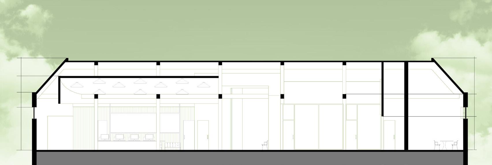 Following the same conceptual direction, this project has a traditional structure composed of beams, columns and a diagonal roofing system. Usually this would be made out of wood, reinforced with thick walls on the perimeter that stabilized the whole building. But for this project wood was replaced by a metal structure acompanied with reinforced concrete, the changes in material and sructure are supossed to evoque the old feeling, in a bigger scale for a public building instead of a small house or temple. The structure is repeated along the two main “buildings” of the exhibit and a smaller more simple version is used for the temporary exhibit. For the cafe a simple roof garden in reinforced concrete structure is used.