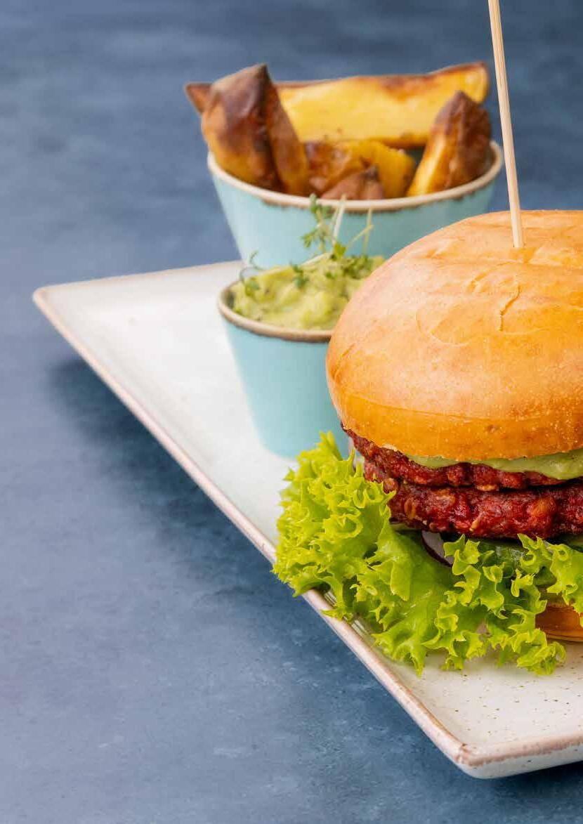 »Veggie« Burger E1, E4, F, H, I 17,90 Briochebrötchen, Haferflocken-Burger mit roter Bete (220g), Salat, Avocadocreme, roten Zwiebeln, Gurke und Kartoffelwedges