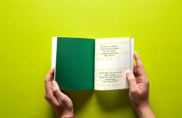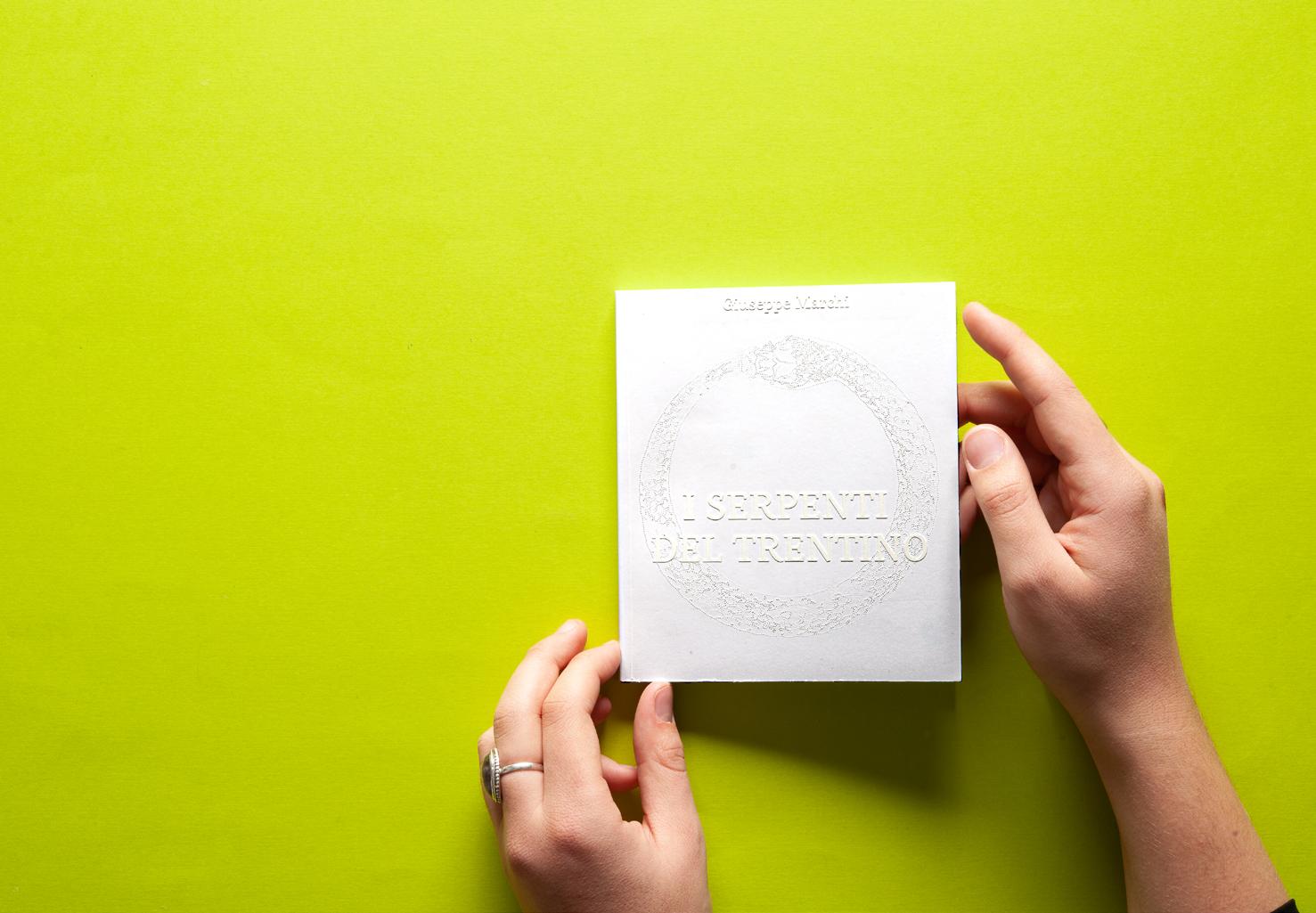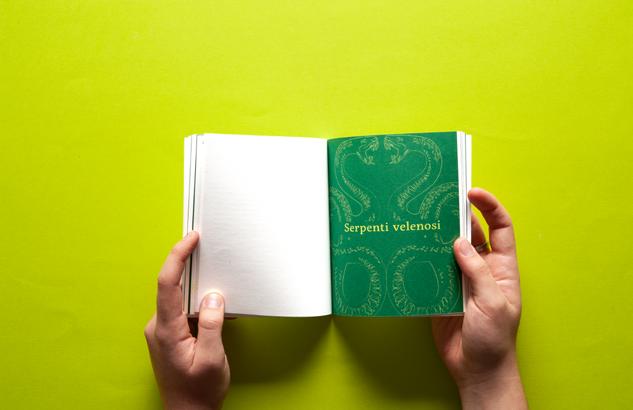 The book also reserves some small peculiarities, such as mysterious and original illustrations, typo graphic quotes, uv printed pages in green and yellow to have the feeling of it by touching, and a white-on-white cover that allows the reader to feel the snake on its surface even though it is not entirely and clearly visible.