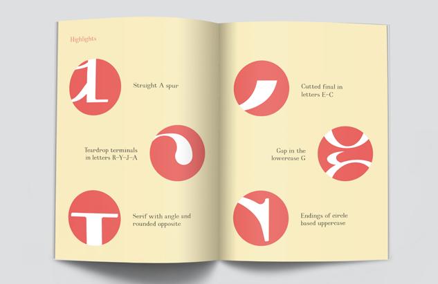 Based on and derived from Didot, for its skeleton and high contrasts, this font is quite formal, althou gh there are small, more playful elements given by the various serifs and some slightly more modern letters.