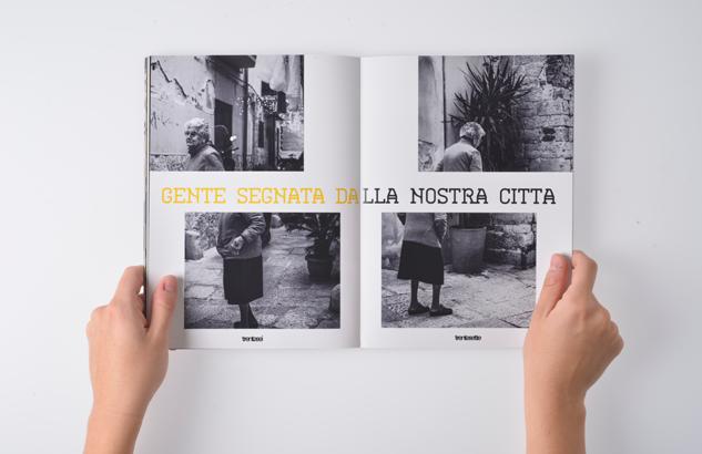 The choice of this strong typography aims to create a desired and visible contrast between the topic and the way it is presented. Furthermore, the use of two fonts: “Bari Lettering” and “Bari Ornaments”, rea lised by BCPT Associati Perugia, which are inspired by the ornaments of the old city give a more deep experience of the book. New and old can this way coexist and invite to the discovery of the content.