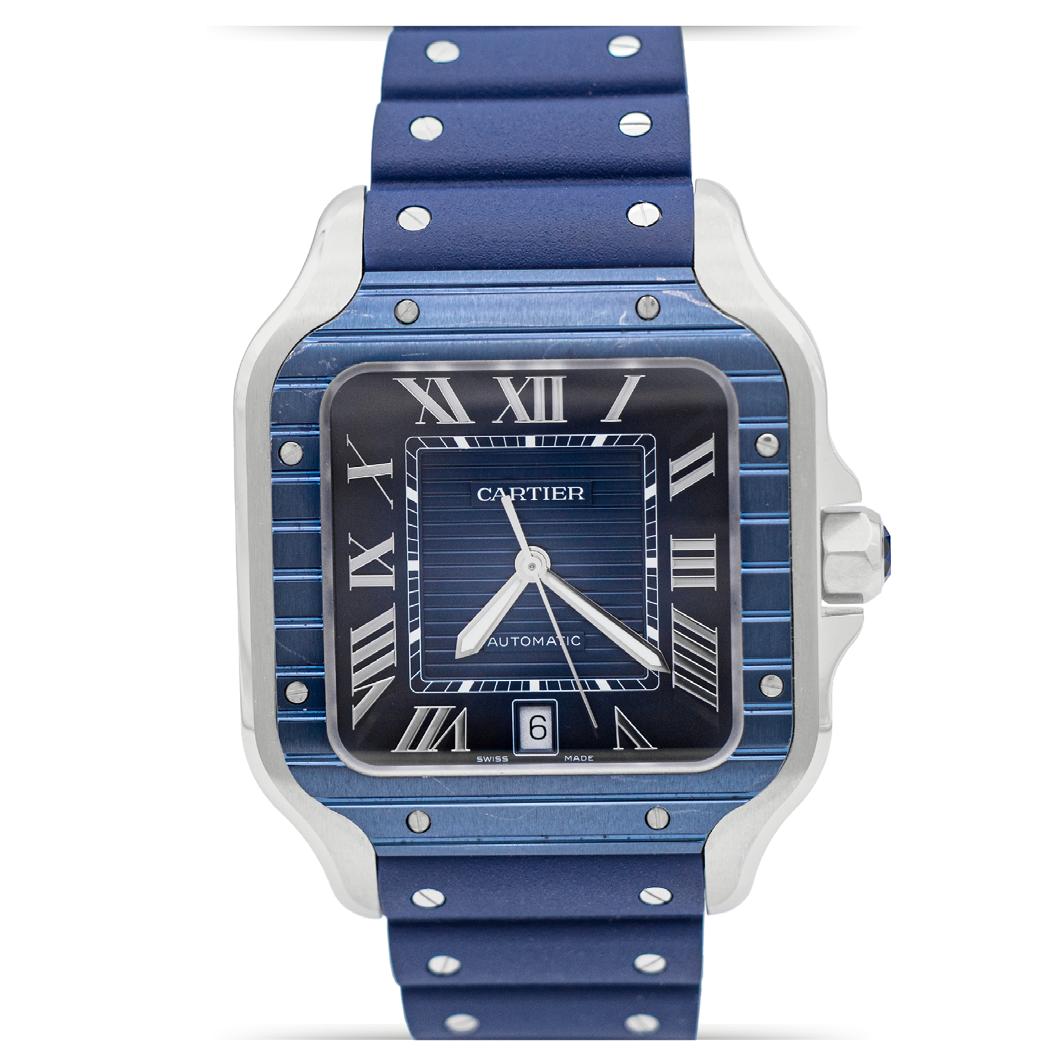 reLoJ para CabaLLero “CarTIer” *sanTos bLue dIaL* CIrCa 2022, reFerenCIa Wssa0048 caja 38x47 mm en acero, Pulso caucHo, carátula azul/negro, números romanos, movImIento automátIco, serIe 16618xxx, calIbre 1847 mc, joyas 23, gramos 84.9, estaDo De conservacIón satIsfactorIo