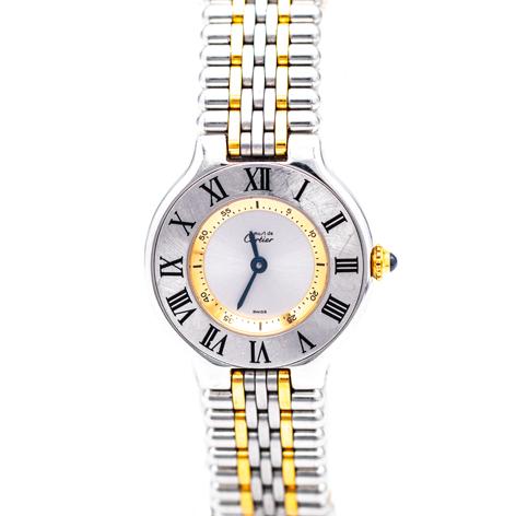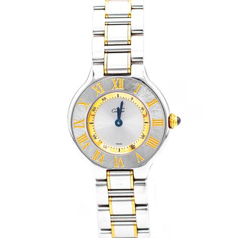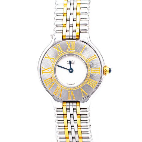 reloj Para Dama “cartIer” *must 21* referencIa w10073r6 caja 28 mm y Pulso en acero y acero DoraDo, carátula PlateaDa, bIsel números romanos, movImIento cuarzo, serIe mx870xxx, calIbre 690, joyas 8, gramos 54.7, Pulso 14.0 cms., estaDo De conservacIón satIsfactorIo