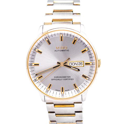 reloj Para caballero “mIDo” *commanDer* referencIa m021.431.22.071.00 caja 40mm y Pulso en acero y acero DoraDo, carátula PlateaDa sIn cIfras, movImIento automátIco, número De serIe no vIsIble, gramos 126.6, estaDo De conservacIón satIsfactorIo