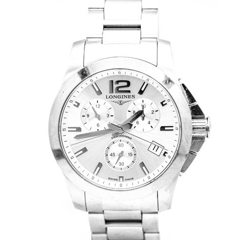 reloj Para caballero “longInes” *conquest* referencIa l3.660.4.76.6 caja 41 mm y Pulso en acero, carátula PlateaDa sIn cIfras, cronógrafo, movImIento cuarzo, serIe 41723xxx gramos 182.8, estaDo De conservacIón satIsfactorIo