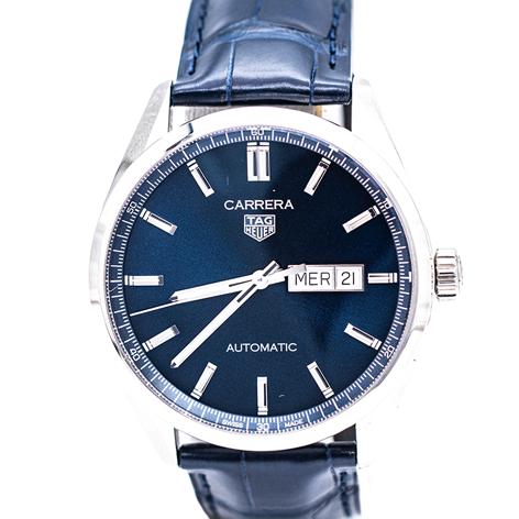 Heuer” *carrera* referencIa wbn2012.fc6502 caja 41 mm en acero, Pulso PIel, carátula azul sIn cIfras, movImIento automátIco, DIa y Hora serIe wqk0xxx, calIbre 5, joyas 26, gramos 93.8, estaDo De conservacIón bueno