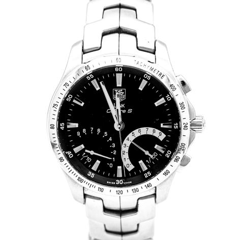 reloj Para caballero “tag Heuer” *lInk* referencIa cjf7110 caja 42 mm y Pulso en acero, carátula negra sIn cIfras, cronógrafo, movImIento cuarzo, serIe erm8xxx, calIbre s, joyas 27, gramos 161.6, estaDo De conservacIón satIsfactorIo