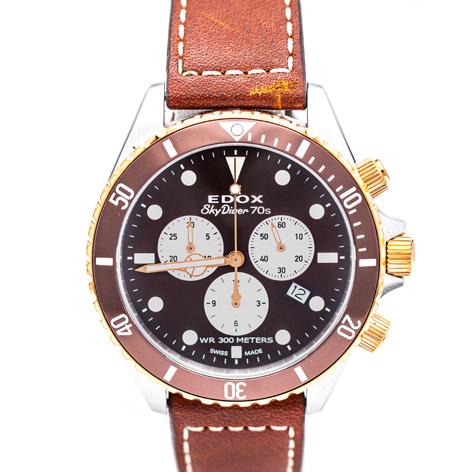 reloj Para caballero “eDox” *HerItage skyDIver 70 s* caja 44 mm en acero, Pulso PIel, carátula marrón, cronógrafo, movImIento cuarzo, serIe 1338xxx, gramos 95.5, estaDo De conservacIón satIsfactorIo