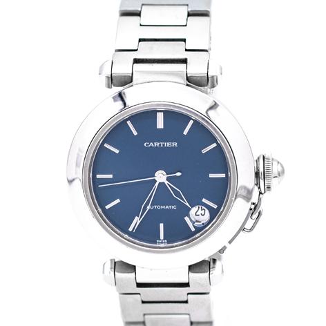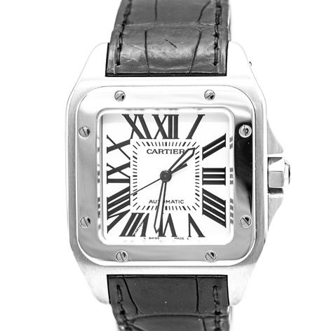 reloj Para caballero “cartIer” *santos 100* referencIa w20076x8 caja 38 mm en acero, Pulso PIel, carátula PlateaDa, números romanos, movImIento automátIco, serIe 73153xxx, calIbre 049, joyas 21, gramos 130.5, estaDo De conservacIón satIsfactorIo, (Pernos con Detalle)
