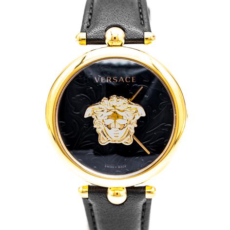 reloj Para caballero “versace” referencIa vec0014200 caja 39 mm en acero DoraDo, Pulso PIel, carátula negra sIn cIfras, movImIento cuarzo, serIe 201005970xxx, gramos 51.4, estaDo De conservacIón sIn usar, con garantía, estucHe y caja