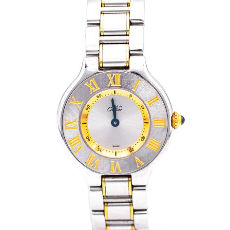 reloj Para Dama “cartIer” *must 21* referencIa w10073r6 caja 28 mm y Pulso en acero y acero DoraDo, carátula PlateaDa, bIsel números romanos, movImIento cuarzo, serIe Pl290xxx, calIbre 690, joyas 8, gramos 57.5, estaDo De conservacIón satIsfactorIo
